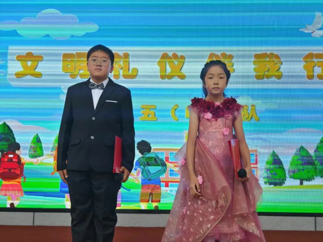 五(1)中队带来“校园文明”主题展示,通过朗朗上口的文明童谣、整齐划一的手势舞,展现课堂礼仪、校园课间活动秩序、交往礼仪等场景,让文明理念以鲜活的形式深入人心。