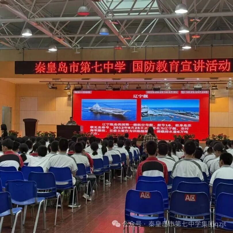 为增强青少年国防意识,弘扬爱国主义精神,9月22日,秦皇岛市第七中学在水一方校区多功能厅开展了一场主题为“传承红色基因,接续踔厉奋进”的国防教育专题讲座。海港区人民武装部上校政治委员艾建军受邀主讲,为同学们带来一堂深刻而振奋人心的国防教育课。第七中学集团校长郑庆利、第七中学党总支书记秦凌云、第七中学副校长常永胜参加本次活动。